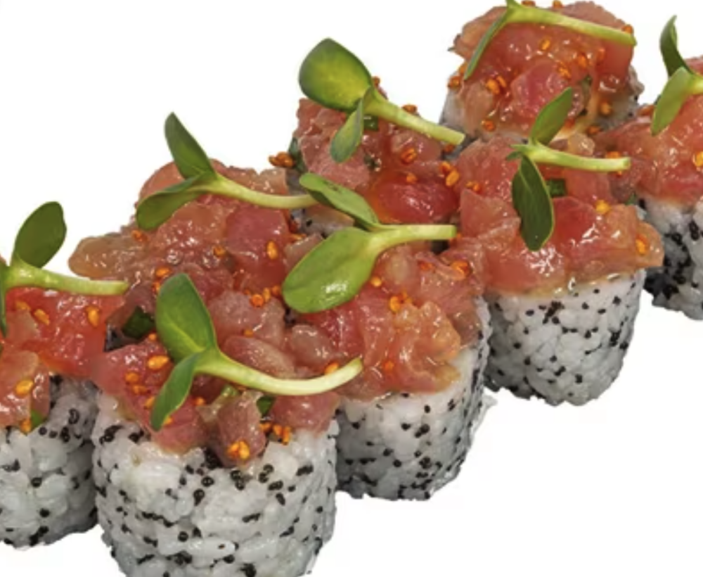Рис, сыр сливочный, салат листовой, тунец, авокадо, соус юдзу, лук зелёный, тобико черная, кунжут. Соевый соус, имбирь и васаби приобретаются отдельно. Изображение на сайте и внешний вид продукта могут отличаться.