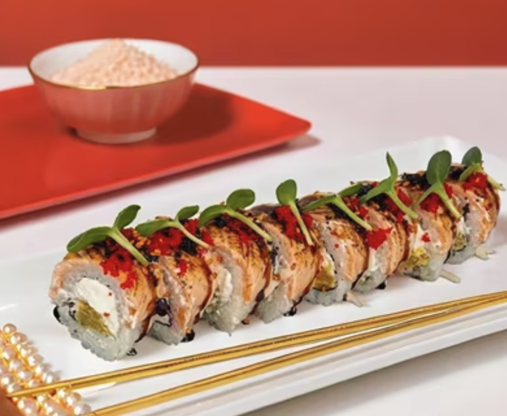 Рис, сыр сливочный, лосось, соус унаги, соус Чили сладкий, Тобико красная, Тобико черная, , апельсин, Микрозелень. Соевый соус, имбирь и васаби приобретаются отдельно. Изображение на сайте и внешний вид продукта могут отличаться