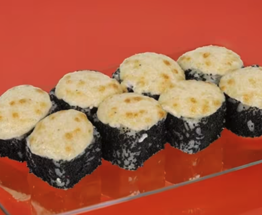 Рис, масаго черная, салат листовой, сыр сливочный, лосось копчёный, лук зелёный, запечённая шапочка с сыром дорблю. Соевый соус, имбирь и васаби приобретаются отдельно. Изображение на сайте и внешний вид продукта могут отличаться.
