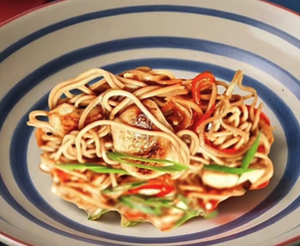 Пшеничная лапша, куриная грудка, ананасы, перец болгарский, фасоль, кисло-сладкий соус. Изображение на сайте и внешний вид продукта могут отличаться.