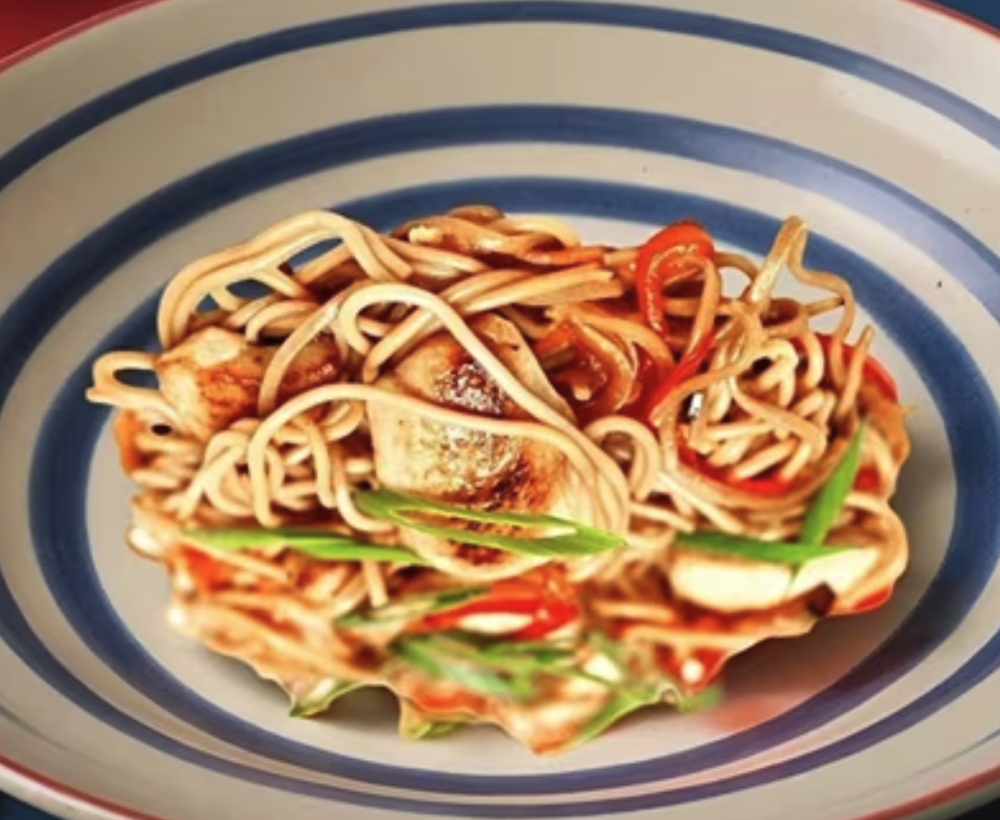 Пшеничная лапша, куриное филе, соус кимчи, соус терияки, чесночный соус, овощи (болгарский перец, кабачок, морковь). Изображение на сайте и внешний вид продукта могут отличаться.