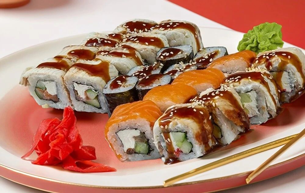 Канада, Дуэт, Унаги маки. В комплекте: соевый соус (1 шт.) , имбирь (1 шт.), васаби (1 шт.). Изображение на сайте и внешний вид продукта могут отличаться.