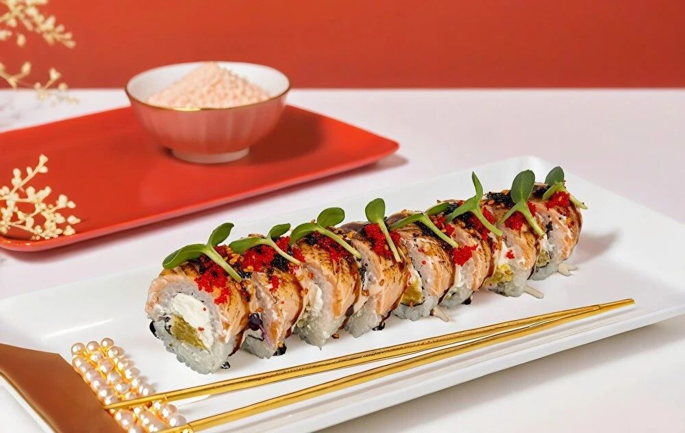 Рис, сыр сливочный, лосось, соус унаги, соус Чили сладкий, Тобико красная, Тобико черная, , апельсин, Микрозелень. Соевый соус, имбирь и васаби приобретаются отдельно. Изображение на сайте и внешний вид продукта могут отличаться.