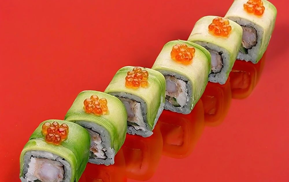 Огурец, креветки, сыр сливочный, икра. Соевый соус, имбирь и васаби приобретаются отдельно. Изображение на сайте и внешний вид продукта могут отличаться.