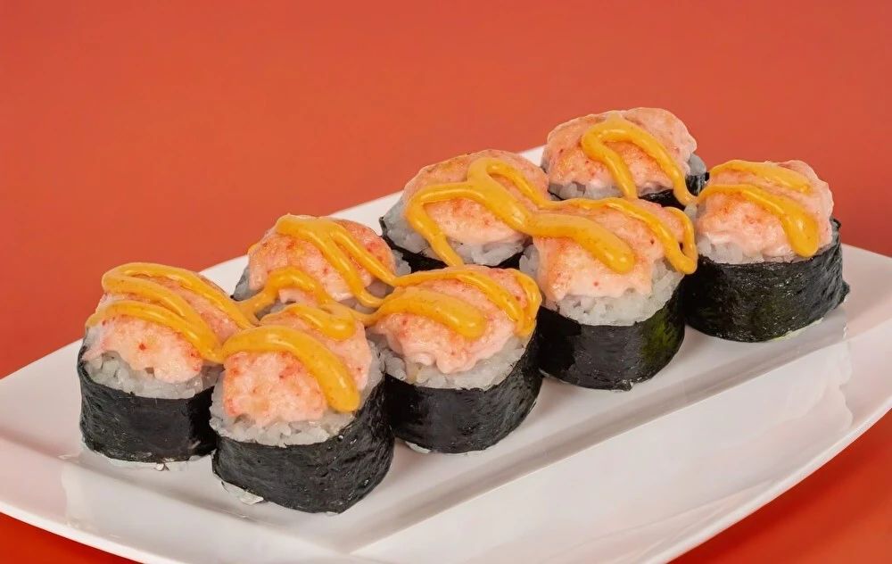 Рис, сыр сливочный, бекон, лук зелёный, перец болгарский, запеченная шапочка, спайси соус. Соевый соус, имбирь и васаби приобретаются отдельно. Изображение на сайте и внешний вид продукта могут отличаться.