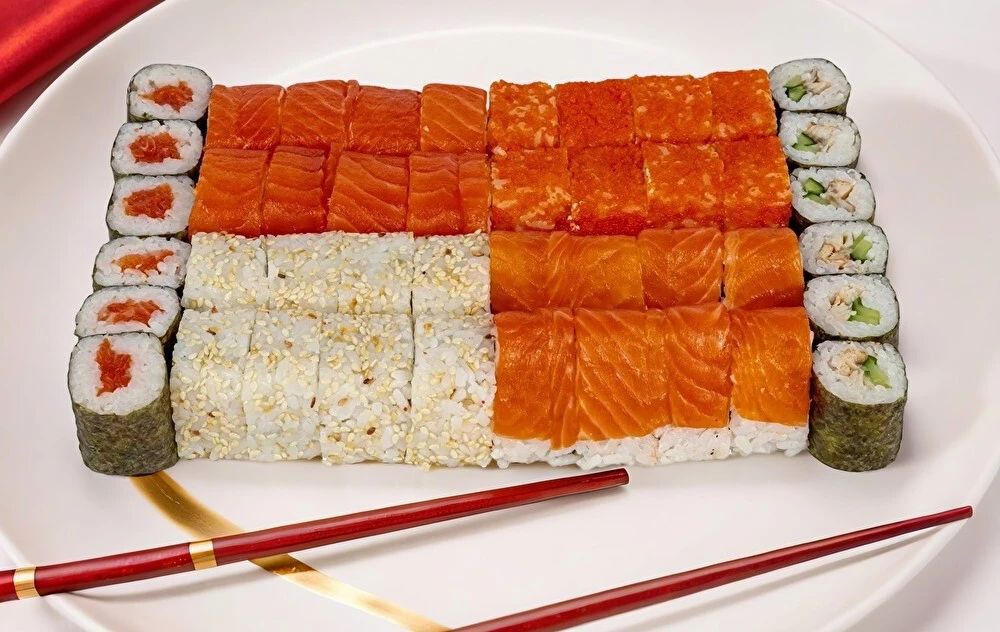 Осака, Аляска, Пирамида, Калифорния, унаги маки, сяке маки. В комплекте: соевый соус (1 шт.) , имбирь (1 шт.), васаби (1 шт.). Изображение на сайте и внешний вид продукта могут отличаться.