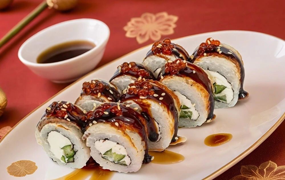 Рис, сыр сливочный, огурцы, угорь, икра красная, унаги-соус, кунжут. Соевый соус, имбирь и васаби приобретаются отдельно. Изображение на сайте и внешний вид продукта могут отличаться.
