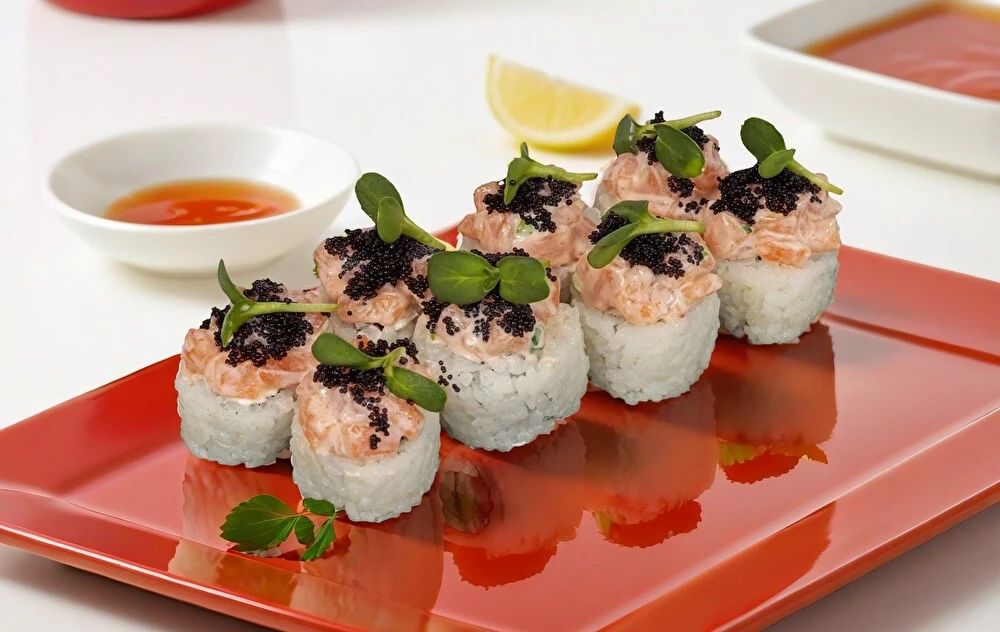 Рис, сыр сливочный, огурец, салат листовой, лосось, соус Чили сладкий, Тобико чёрная Микрозелень. Соевый соус, имбирь и васаби приобретаются отдельно. Изображение на сайте и внешний вид продукта могут отличаться.