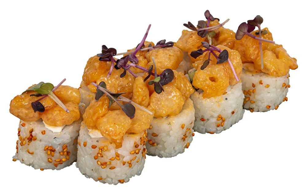 Рис, сыр сливочный, креветки, салат листовой, огурец, кунжут, спайси-соус, сгущённое молоко. Соевый соус, имбирь и васаби приобретаются отдельно. Изображение на сайте и внешний вид продукта могут отличаться.