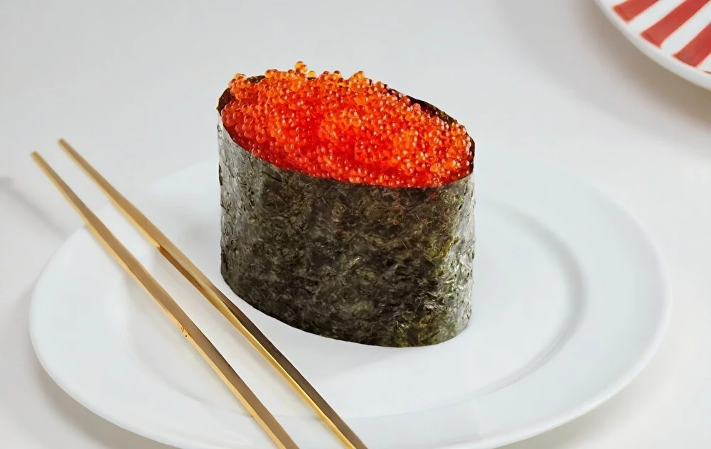 Рис, тобико красная. Соевый соус, имбирь и васаби приобретаются отдельно.