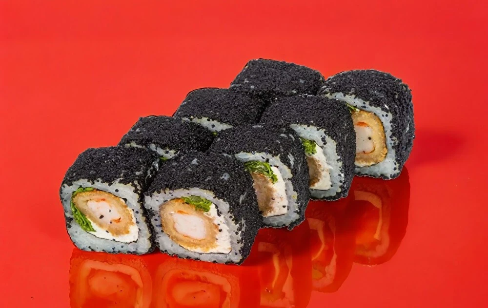 Рис, сыр сливочный, креветка темпура, масаго черная. Соевый соус, имбирь и васаби приобретаются отдельно.