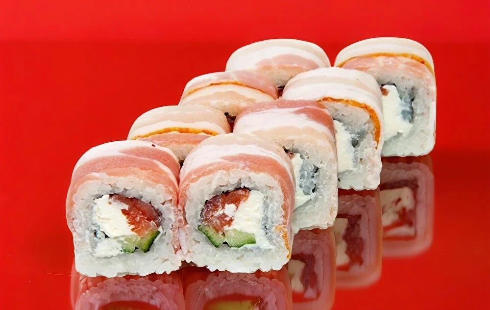 Огурец, айсберг, лук зеленый, майонез хайнц, бекон. Соевый соус, имбирь и васаби приобретаются отдельно.