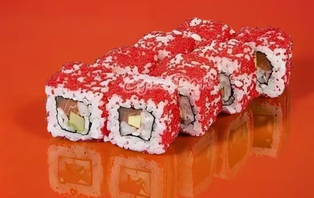 Огурец, авокадо, майонез, лосось. Соевый соус, имбирь и васаби приобретаются отдельно