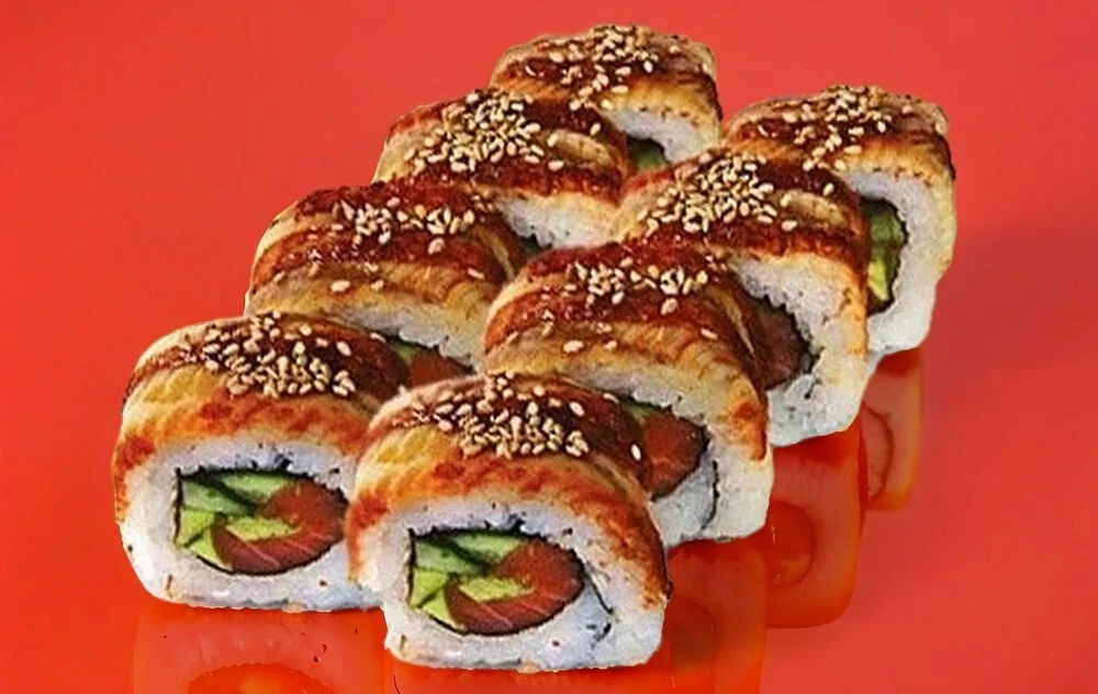 Угорь, лосось, огурец, сыр. Соевый соус, имбирь и васаби приобретаются отдельно.