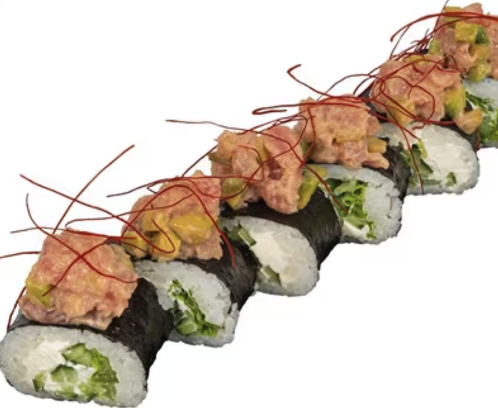 Рис, сыр сливочный, тунец, салат листовой, огурец, авокадо, соус, лук зелёный, нити чили. Соевый соус, имбирь и васаби приобретаются отдельно. Изображение на сайте и внешний вид продукта могут отличаться.
